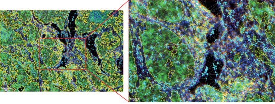 利用全組織掃描成像并結(jié)合深度學(xué)習(xí)算法,可以識別不同免疫細胞以及分析其與腫瘤區(qū)域的距離。本案例證明了InnoQuant提供的整張掃描圖像可以在第三方分析軟件中生成相關(guān)數(shù)據(jù)。圖像質(zhì)量高,可以得到如細胞計數(shù)和鄰近分析等統(tǒng)計學(xué)分析,以更好地了解患者的特定病理生理狀況。這些空間和定量的數(shù)據(jù)可用于進一步預(yù)測免疫腫瘤領(lǐng)域的治療反應(yīng)。