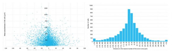 對距腫瘤細胞區(qū)域不同距離的相鄰三個 CD8+ T 細胞間面積的分析表明,絕大部分相鄰CD8+ T細胞形成的三角形面積都在600μm2以下,且與腫瘤細胞區(qū)域邊界的距離都在±12μm的范圍內(nèi)。面積越小,證明CD8+ T細胞密度越高,而且都集中分布在腫瘤區(qū)域周圍。說明正如圖4中所看到的,CD8+ T細胞的分布受到腫瘤細胞區(qū)域的影響,絕大部分CD8+ T細胞都圍繞著腫瘤細胞區(qū)域(圖5)。