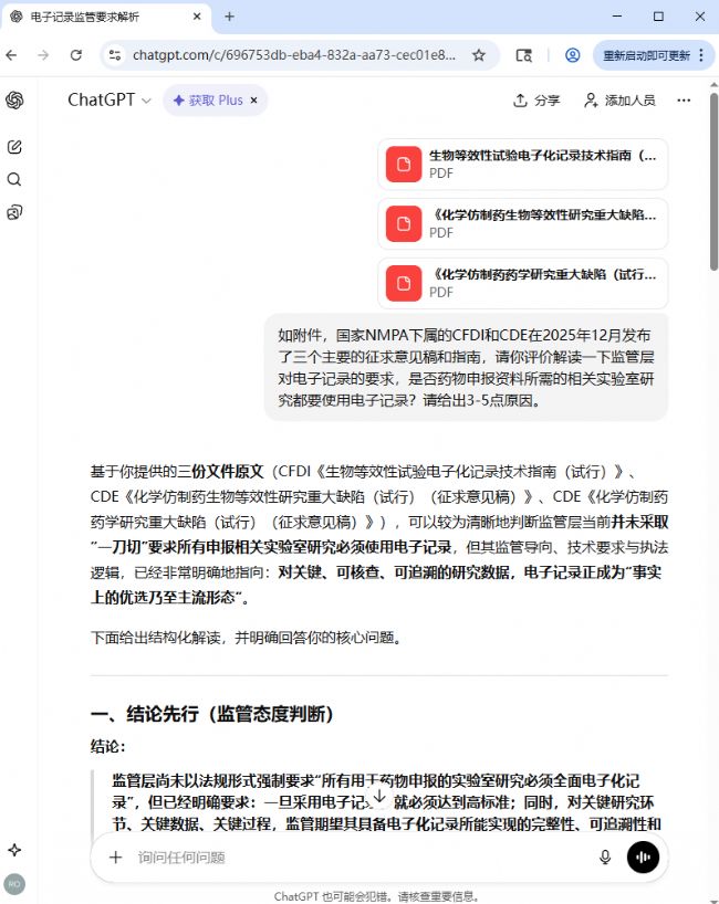 提示詞:如附件,國家NMPA下屬的CFDI和CDE在2025年12月發(fā)布了三個主要的征求意見稿和指南,請你評價解讀一下監(jiān)管層對電子記錄的要求,是否藥物申報資料所需的相關實驗室研究都要使用電子記錄?請給出3-5點原因。
