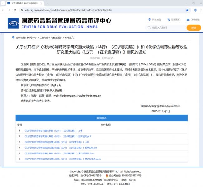 [2] NMPA CDE. 關于公開征求《化學仿制藥藥學研究重大缺陷(試行)(征求意見稿)》和《化學仿制藥生物等效性研究重大缺陷(試行)(征求意見稿)》意見的通知, 2025.12.
