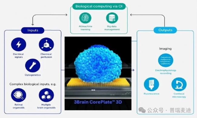 三維腦類器官作為核心計算單元,其神經(jīng)網(wǎng)絡(luò)動態(tài)用于信息處理。外部輸入(如電刺激與化學(xué)信號)作用于系統(tǒng),輸出則通過電生理記錄與成像手段獲取,并用于分析與反饋調(diào)控。人工智能方法參與信號的編碼與解碼,構(gòu)建生物與計算系統(tǒng)結(jié)合的混合計算框架。圖中展示了實(shí)現(xiàn)類器官高分辨率記錄與刺激交互的三維電極平臺 (3Brain CorePlate™ 3D) 示意。圖片改編自 Smirnova et al., 2023。