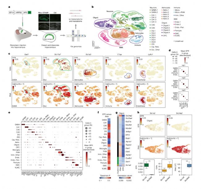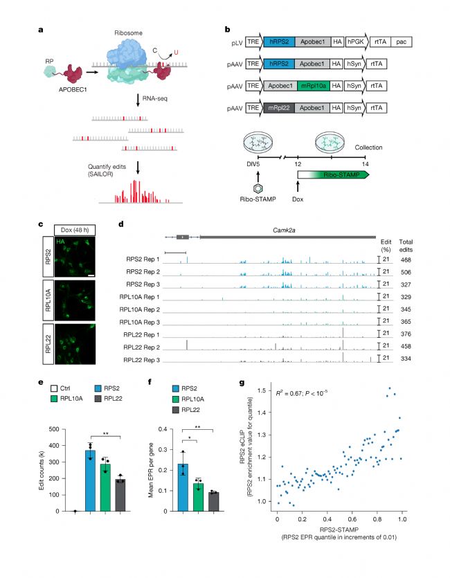 在這項(xiàng)研究中,研究者使用一種能進(jìn)行單細(xì)胞轉(zhuǎn)錄后翻譯調(diào)控檢測(cè)的Ribo-STAMP技術(shù),構(gòu)建了神經(jīng)元特異的AAV病毒載體,將RNA編輯酶APOBEC1與核糖體蛋白R(shí)PS2、RPL10A或RPL22融合,通過將翻譯事件“編碼”為RNA上的可測(cè)序標(biāo)記(C-to-U編輯),結(jié)合RNA測(cè)序,同時(shí)讀取“轉(zhuǎn)錄本豐度”和“編輯標(biāo)記密度”,以編輯reads百分比(EPR)作為量化指標(biāo),反映了特定mRNA在細(xì)胞內(nèi)的翻譯活躍程度。