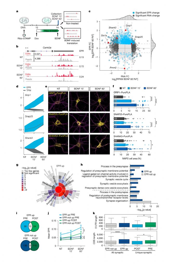 通過在原代神經(jīng)元中的表達(dá)驗(yàn)證,發(fā)現(xiàn)RPS2-STAMP變體表現(xiàn)出最高的編輯效率,確立了RPS2-STAMP作為后續(xù)神經(jīng)元單細(xì)胞翻譯調(diào)控檢測(cè)的最優(yōu)工具。接下來,研究人員利用腦源性神經(jīng)營(yíng)養(yǎng)因子(BDNF)刺激原代神經(jīng)元以評(píng)估Ribo-STAMP的翻譯檢測(cè)能力。結(jié)果顯示,Ribo-STAMP成功捕獲了BDNF誘導(dǎo)的翻譯變化,發(fā)現(xiàn)了數(shù)百個(gè)翻譯水平顯著改變的基因,并通過鄰近連接技術(shù)(PLA)驗(yàn)證了其中多個(gè)基因(如GRIP1、SNAP25和PMM2)的翻譯變化,并發(fā)現(xiàn)翻譯上調(diào)的基因富集于突觸功能相關(guān)通路。這證明了Ribo-STAMP能夠靈敏地檢測(cè)神經(jīng)元在刺激下的翻譯動(dòng)態(tài)。