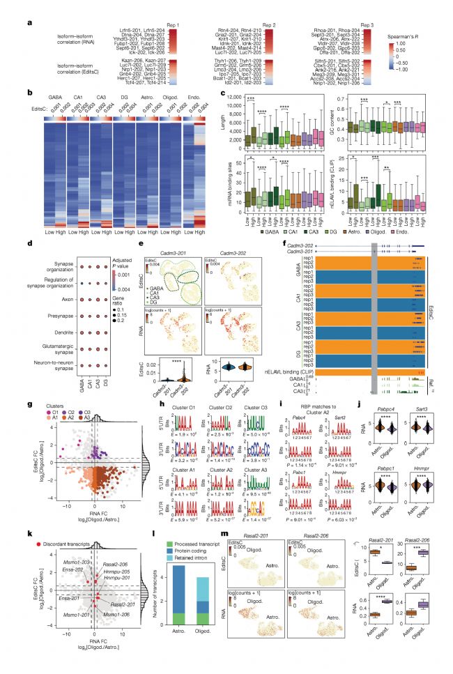 為了解析單細(xì)胞中轉(zhuǎn)錄本異構(gòu)體水平的翻譯情況,研究者將Ribo-STAMP與單細(xì)胞長(zhǎng)讀長(zhǎng)測(cè)序結(jié)合,通過10x Genomics 3′ kit進(jìn)行單細(xì)胞cDNA生成并使用PacBio MAS-ISO-seq串聯(lián)方法進(jìn)行文庫構(gòu)建,最終在Revio平臺(tái)上進(jìn)行測(cè)序,實(shí)現(xiàn)了單細(xì)胞中異構(gòu)體水平的翻譯檢測(cè)。通過EditsC(編輯胞嘧啶比例)計(jì)算分析發(fā)現(xiàn),在不同細(xì)胞類型中,同一基因的不同異構(gòu)體存在顯著差異翻譯。例如,突觸形成的重要細(xì)胞粘附分子Cadm3-202異構(gòu)體因具有更長(zhǎng)的3′ UTR和獨(dú)特的nELAVL結(jié)合位點(diǎn),翻譯水平高于其短異構(gòu)體Cadm3-201。比較少突膠質(zhì)細(xì)胞與星形膠質(zhì)細(xì)胞翻譯效率發(fā)現(xiàn),星形膠質(zhì)細(xì)胞中蛋白編碼異構(gòu)體翻譯效率更高,且富集了Pabpc1等RNA結(jié)合蛋白的調(diào)控基序,而少突膠質(zhì)細(xì)胞中發(fā)生內(nèi)含子保留的剪接異構(gòu)體翻譯效率更高,如Rasal2的兩個(gè)亞型在兩種細(xì)胞中呈現(xiàn)翻譯的反向差異,表明少突膠質(zhì)細(xì)胞可能選擇性地使用內(nèi)含子保留作為細(xì)胞類型特異性的翻譯調(diào)節(jié)機(jī)制。