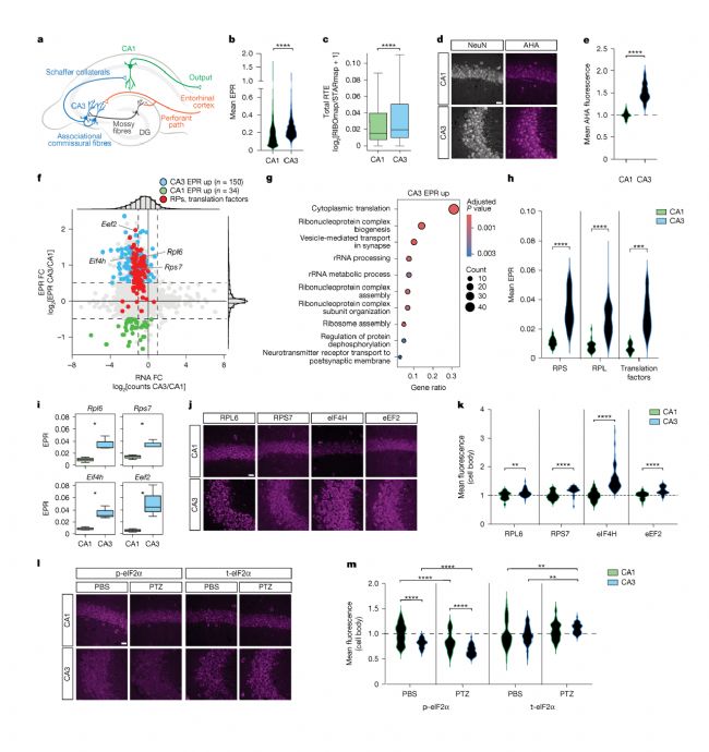 研究人員通過EPR分析發(fā)現(xiàn)CA3神經(jīng)元的整體翻譯水平顯著高于CA1,并通過FUNCAT新生蛋白標(biāo)記和p-eIF2α(翻譯抑制因子)磷酸化水平降低等實(shí)驗(yàn)驗(yàn)證。差異翻譯基因在CA3中富集于核糖體蛋白和翻譯因子,且CA3中EPR較高的基因部分含有5′ TOP基序,這些基序常見于翻譯機(jī)器基因中。相比之下,CA1雖有更多差異表達(dá)的基因和轉(zhuǎn)錄本,但基礎(chǔ)翻譯率較低,揭示了海馬不同亞區(qū)在翻譯層面的差異可能與神經(jīng)元活動(dòng)水平相關(guān)。