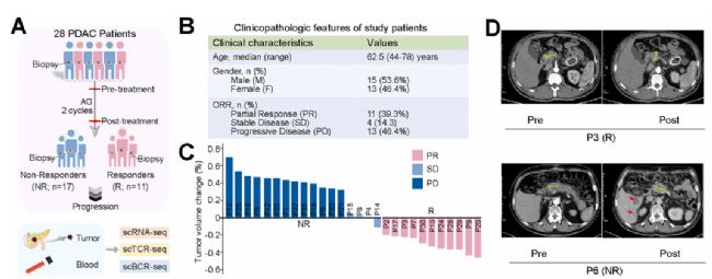 研究納入28例來自上海瑞金醫(yī)院的晚期PDAC患者,均接受AG化療,無既往化療或靶向治療史。采集36份腫瘤活檢樣本(23份化療前、13份化療后,含8對匹配樣本)和24份配對PBMC樣本,通過RECIST 1.1標(biāo)準(zhǔn)評估化療療效:11例(39.3%)為響應(yīng)者(部分緩解PR),13例(46.4%)為非響應(yīng)者(疾病進(jìn)展PD),4例(14.3%)為穩(wěn)定疾。⊿D)。