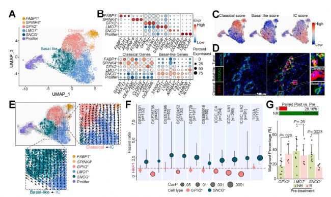 鑒定出6種腫瘤細(xì)胞亞群:3種經(jīng)典型(FABP1⁺、SPINK4⁺、GPX2⁺)、1種基底樣型(SNCG⁺)、1種增殖型(MKI67⁺)、1種中間共表達(dá)型(LMO7⁺)。核心發(fā)現(xiàn):① RNA velocity分析顯示,LMO7⁺中間型細(xì)胞可雙向轉(zhuǎn)換為經(jīng)典型或基底樣型;② 化療前,響應(yīng)者中GPX2⁺經(jīng)典型細(xì)胞比例更高,非響應(yīng)者中SNCG⁺基底樣型細(xì)胞比例更高;③ 化療后,響應(yīng)者腫瘤細(xì)胞向經(jīng)典型轉(zhuǎn)換,非響應(yīng)者向基底樣型轉(zhuǎn)換,且非響應(yīng)者的惡性細(xì)胞總數(shù)增加144.01%,響應(yīng)者減少至預(yù)處理水平的28.16%