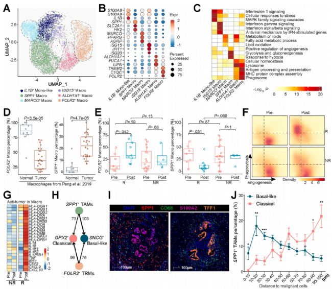 鑒定出6種巨噬細(xì)胞亞型(IL1B⁺、ISG15⁺、MARCO⁺、SPP1⁺、FOLR2⁺、ALDH1A1⁺),其中SPP1⁺ TAMs與化療耐藥密切相關(guān),F(xiàn)OLR2⁺ Trms與化療敏感相關(guān)。核心發(fā)現(xiàn):① 與正常胰腺組織相比,PDAC組織中SPP1⁺ TAMs增多、FOLR2⁺ Trms減少;② 化療后,響應(yīng)者中FOLR2⁺ Trms顯著增加、SPP1⁺ TAMs減少,非響應(yīng)者則維持高比例SPP1⁺ TAMs;③ 配體-受體分析顯示,SPP1⁺ TAMs與SNCG⁺基底樣細(xì)胞通過MMP9-CDH1、VEGFA-AXL等通路相互作用,促進(jìn)耐藥;FOLR2⁺ Trms與GPX2⁺經(jīng)典型細(xì)胞通過TNF-TNFRSF21等通路相互作用,增強(qiáng)化療敏感性。