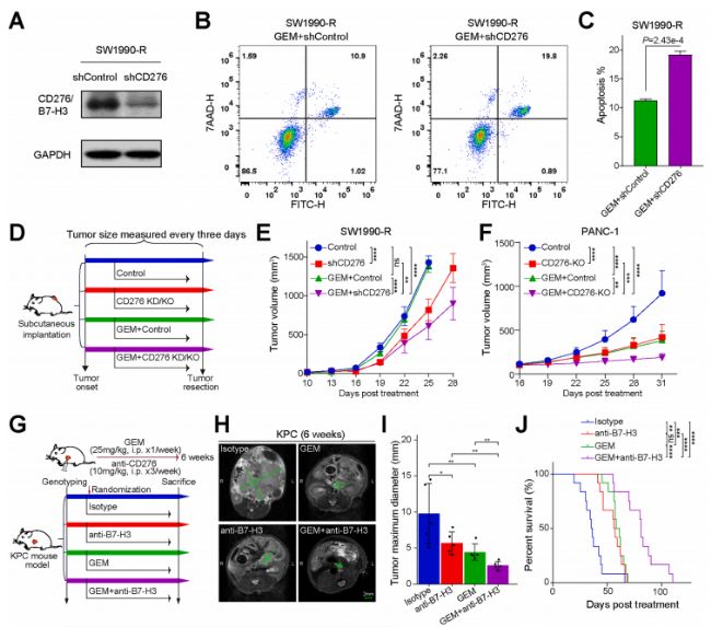 CD276/B7-H3在SNCG⁺基底樣細(xì)胞和LMO7⁺中間型細(xì)胞中高表達(dá),且在非響應(yīng)者中表達(dá)顯著高于響應(yīng)者,化療后表達(dá)進(jìn)一步升高。核心發(fā)現(xiàn):① 體內(nèi)外實(shí)驗(yàn)證實(shí),敲低/敲除CD276可促進(jìn)腫瘤細(xì)胞向經(jīng)典型轉(zhuǎn)換,抑制基底樣型標(biāo)志物表達(dá);② 靶向CD276可增強(qiáng)CD8⁺ T細(xì)胞的細(xì)胞毒性,減少T細(xì)胞耗竭,降低SPP1⁺ TAMs的血管生成能力;③ 動物實(shí)驗(yàn)中,CD276抑制劑聯(lián)合AG化療可顯著抑制腫瘤生長,延長KPC小鼠的生存期,且無明顯毒性。