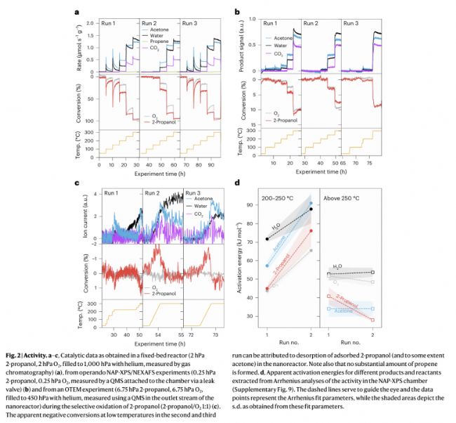 數(shù)據(jù)證明,無(wú)論是在常規(guī)宏觀反應(yīng)器,還是在原位光譜和原位電鏡的微觀環(huán)境中,催化劑表現(xiàn)出高度一致的活性演化規(guī)律(特別注意圖注中提到的低溫區(qū)脫附導(dǎo)致的表觀負(fù)轉(zhuǎn)化率現(xiàn)象)。這就為后續(xù)將光譜數(shù)據(jù)和電鏡數(shù)據(jù)關(guān)聯(lián)起來(lái),奠定了堅(jiān)實(shí)的工況等效性基礎(chǔ)。