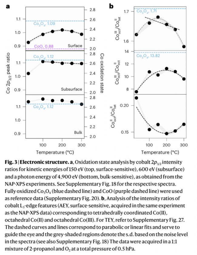 原位 XPS 和 NEXAFS 數(shù)據(jù)明確顯示,在反應(yīng)工況下,催化劑表面和次表面的 Co 氧化態(tài)并沒(méi)有隨溫度單調(diào)變化,而是呈現(xiàn)出一種拋物線式的演變。在某個(gè)特定溫度區(qū)間(結(jié)合前文可知在 200°C 附近),表面 Co 的平均氧化態(tài)達(dá)到了最高值(拋物線的頂點(diǎn)),隨后在更高溫度下再次下降。這暗示了在此溫度節(jié)點(diǎn),催化劑表面發(fā)生了某種劇烈的重構(gòu)。