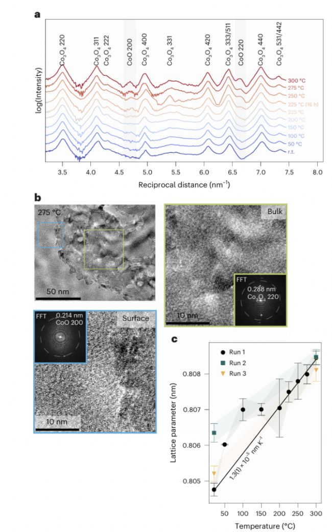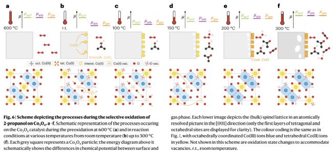 作者將原本靜態(tài)的催化機(jī)理,升格為一幅動(dòng)態(tài)的、受化學(xué)勢(shì)梯度驅(qū)動(dòng)的固態(tài)相演變圖景。從室溫起,氣相(異丙醇還原性)與體相(高價(jià)氧化物)的化學(xué)勢(shì)差異,驅(qū)動(dòng)了體相陽(yáng)離子向表面遷移(溶出),導(dǎo)致表面失氧和還原(對(duì)應(yīng) Fig 3),同時(shí)在體相留下空位導(dǎo)致晶格異常膨脹(對(duì)應(yīng) Fig 5c)。隨著溫度升高,空位聚集成納米孔洞(對(duì)應(yīng) Fig 4),表面無(wú)定形溶出物最終在 225°C 以上結(jié)晶為穩(wěn)定的 CoO 相(對(duì)應(yīng) Fig 5a, b)。