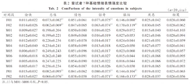 對(duì)于情緒變化的結(jié)果分析顯示,悲傷、驚奇、懼怕三種情緒在觀看視頻前后與觀看視頻期間存在顯著差異(表1)。具體為三種情緒強(qiáng)度在觀看視頻期間均顯著升高。此外,憤怒情緒強(qiáng)度在觀看視頻前3 min基本與基線一致,觀看視頻結(jié)束后則迅速衰減至基線水平以下。這都可能與情緒消退快及移情模仿反應(yīng)有關(guān)。此外,研究發(fā)現(xiàn)誘發(fā)出的情緒在變化趨勢(shì)上具有一定的同步性,即這些負(fù)面情緒程度彼此存在聯(lián)系,且皆與暴力攻擊行為存在一定關(guān)聯(lián)。