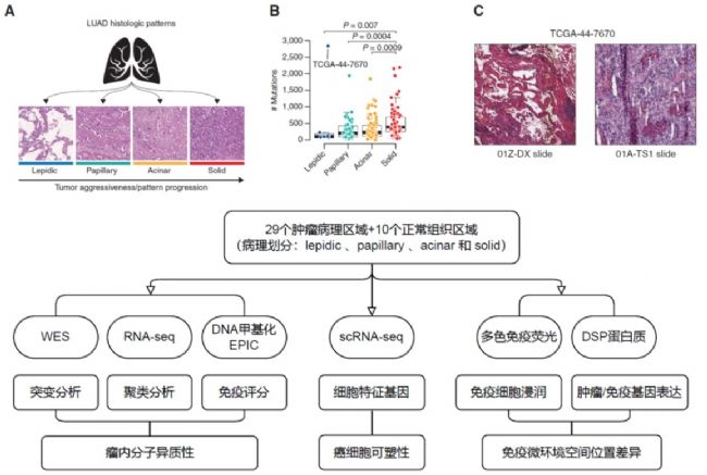 本研究繪制了肺腺癌瘤內(nèi)空間異質(zhì)性的精細(xì)分子圖譜,揭示了腫瘤進(jìn)展過程中的非遺傳進(jìn)化途徑。作者依據(jù)組織學(xué)模式的分布特征對(duì)肺腺癌進(jìn)行分類,并發(fā)現(xiàn)部分腫瘤存在多種組織學(xué)模式共存的現(xiàn)象,其分子特征尚未明確。研究進(jìn)一步闡明了驅(qū)動(dòng)腫瘤內(nèi)不同組織學(xué)模式形成的非遺傳機(jī)制,并鑒定出與患者預(yù)后相關(guān)的分子標(biāo)志物。此外,不同組織學(xué)模式?jīng)Q定了各異的免疫微環(huán)境,為當(dāng)前免疫治療背景下的相關(guān)研究提供了重要依據(jù)。