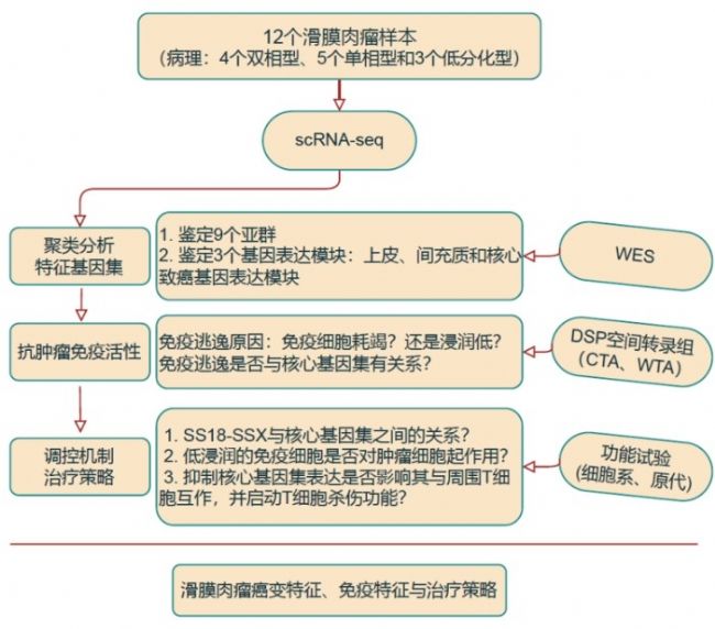 滑膜肉瘤是一種侵襲性間充質(zhì)腫瘤。該類腫瘤均質(zhì)表達(dá)多種具有免疫原性的癌睪丸抗原,這些抗原可被滑膜肉瘤患者外周血中的循環(huán)T細(xì)胞所識(shí)別,然而腫瘤內(nèi)的T細(xì)胞浸潤(rùn)程度卻極低,提示滑膜肉瘤中存在尚未明確的免疫逃逸機(jī)制。為此,本研究結(jié)合單細(xì)胞轉(zhuǎn)錄組測(cè)序與DSP空間轉(zhuǎn)錄組等多組學(xué)方法,系統(tǒng)探究滑膜肉瘤中的癌癥-免疫相互作用。