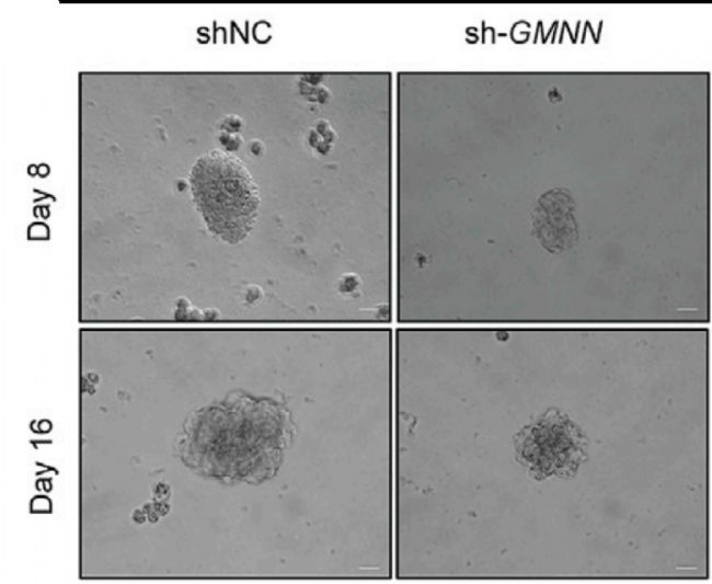 實驗中,研究人員在培養(yǎng)第 8 天和第 16 天對細胞球體進行觀測對比:shNC(陰性對照)組與sh-GEMIN(敲減 geminin 基因)組的細胞球體在形態(tài)學(xué)上呈現(xiàn)出清晰的生長差異,且隨培養(yǎng)時間延長,球體結(jié)構(gòu)的增殖與分化特征愈發(fā)顯著。20μm 的標尺尺度下,細胞球體的形態(tài)、大小及聚集狀態(tài)被精準記錄,為后續(xù)分子機制研究提供了高保真的 3D 細胞模型,讓實驗結(jié)果更能反映腫瘤細胞在體內(nèi)的真實狀態(tài)。