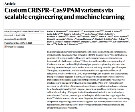2025年4月22日美國(guó)麻省總醫(yī)院和哈佛醫(yī)學(xué)院的科學(xué)家們?cè)凇禢ature》雜志發(fā)表了題為“Custom CRISPR-Cas9 PAM variants via scalable engineering and machine learning”的研究文章,堪稱(chēng)CRISPR技術(shù)發(fā)展的里程碑。