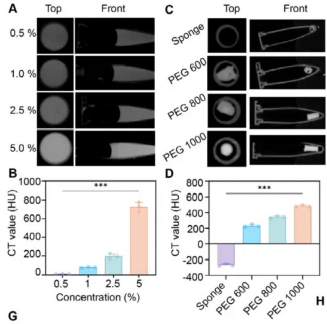 IQCH溶液的CT值顯示出濃度依賴性增加,從0.5wt%時的9±1 HU增加至5wt%時的726±50 HU(圖3A、B),其顯著高于5wt%(2.53 ± 0.51 HU)的QCH溶液的濃度。值得注意的是,用PEG滲透通過替換截留在其多孔結(jié)構(gòu)內(nèi)的空氣而顯著提高了基于IQCH的支架的CT值。注入PEG 1000的支架表現(xiàn)出最高的CT數(shù)(484 ± 13HU),這歸因于其最大的密度(圖3C,D)。因此,除了賦予熱響應可塑性之外,PEG浸潤增強了TRANS的X射線衰減效應,從而允許CT可視化。