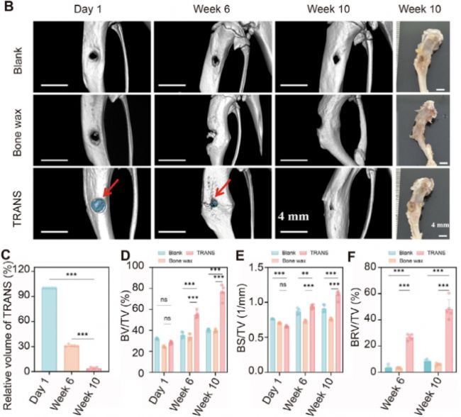 圖7 TRANS的體內(nèi)脛骨再生。(A)體內(nèi)骨再生實驗的示意圖。(B)脛骨修復的Micro-CT 3D重建和照片(C)(B)中植入后TRANS的相對體積(n = 5)。(D)BV/TV的定量分析(E)BS/TV(骨表面/組織體積)和(F)BRV/TV(骨再生體積/組織體積)比率(n = 5)。
