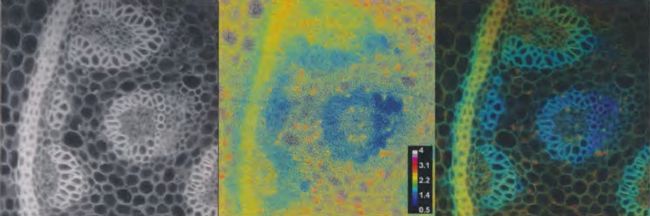 時域中的FLIM,激發(fā)停止后隨時間的熒光的理想響應(yīng),熒光衰減可通過多種途徑獲得。內(nèi)源熒光測量鈴蘭切片樣品(波長=447納米,調(diào)制=30兆赫)左圖顯示熒光強度。中圖給出基于相位角的熒光壽命分布,使用從500納秒到4納秒的假彩色編碼。右圖顯示與熒光強度加權(quán)后的壽命圖像,使用相同的假彩色編碼。加權(quán)抑制了嘈雜的壽命值。