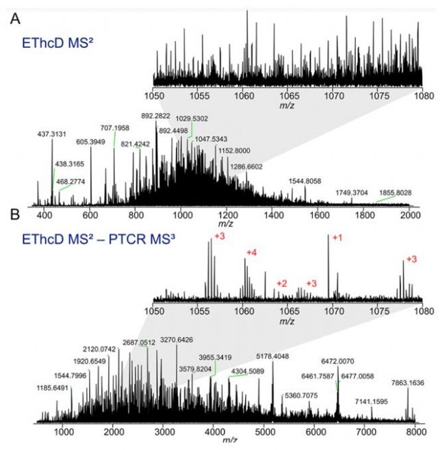PTCR將原本集中在 800-1400 m/z 范圍的碎片離子分散至 500-8000 m/z 區(qū)間,降低碎片離子譜圖的復雜度,同時提升診斷離子的檢測率和鑒定可信度。