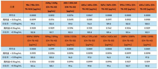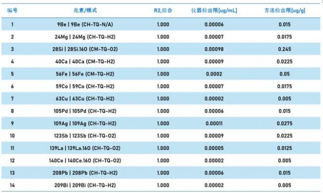 按照設(shè)定的測量參數(shù)和采集模式,進(jìn)行標(biāo)準(zhǔn)加入-標(biāo)準(zhǔn)曲線測量,所有測試數(shù)據(jù)完成于常規(guī)實驗室,在非潔凈間條件下標(biāo)準(zhǔn)曲線線性、儀器檢出限及方法檢出限數(shù)據(jù)信息如下: