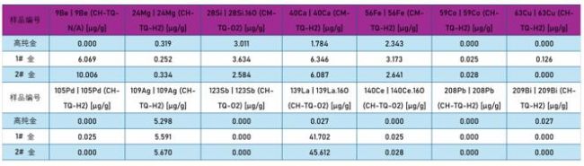 2. 方法檢出限以采高純金溶液條件下的儀器檢出限X250倍稀釋倍數(shù)計算,單位為ug/g