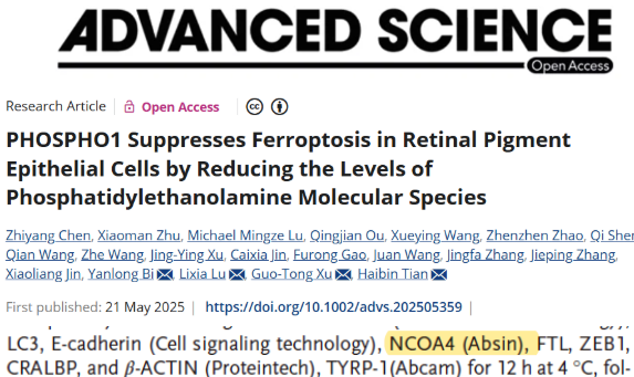 年齡相關(guān)性黃斑變性(AMD)是導(dǎo)致老年人視力喪失的主要原因之一,而視網(wǎng)膜色素上皮(RPE)細胞的鐵死亡被證實是 AMD 發(fā)病的核心機制。近期《Advanced Science》發(fā)表重磅研究,揭示了 PHOSPHO1 通過調(diào)控磷脂酰乙醇胺(PE)代謝和自噬抑制 RPE 細胞鐵死亡的雙重機制,為 AMD 治療提供了全新靶點。Absin 優(yōu)質(zhì)抗體產(chǎn)品全程助力該研究的機制驗證,為科學(xué)突破保駕護航!