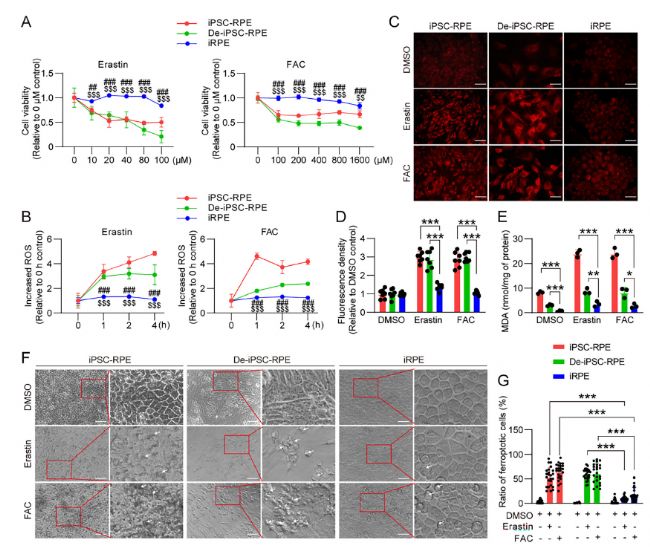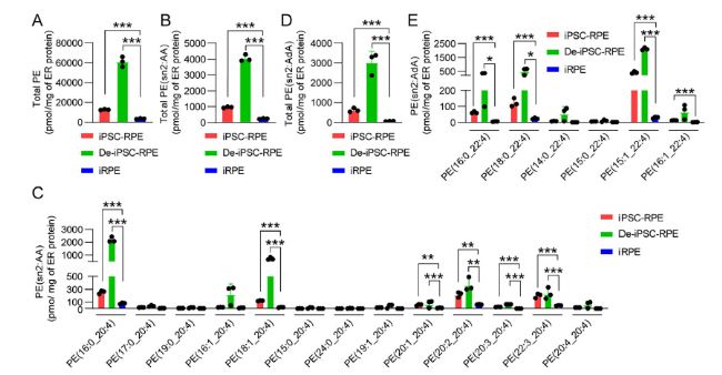 脂質(zhì)組學(xué)分析顯示,iRPE 細胞 ER 中總 PE 水平及關(guān)鍵脂質(zhì)過氧化底物 PE-AA、PE-AdA 水平顯著降低(圖 2A-E)。通過 meclizine 抑制 PE 合成或乙醇胺升高 PE 水平的干預(yù)實驗,直接證實:適度降低 PE 可增強 RPE 細胞抗鐵死亡能力,而 PE 過度減少會導(dǎo)致細胞死亡。