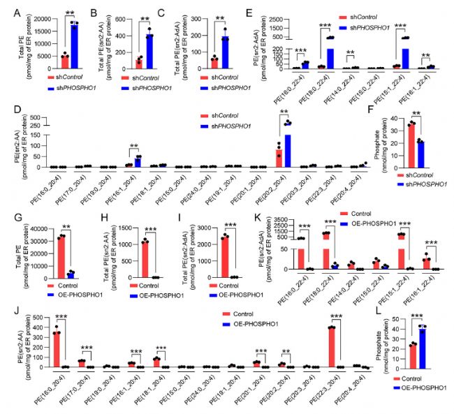 PHOSPHO1 水解 PE 合成底物磷酸乙醇胺,降低 ER 中 PE 水平,減少脂質(zhì)過氧化(圖 5A-L);