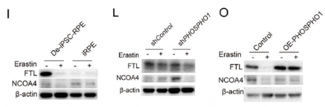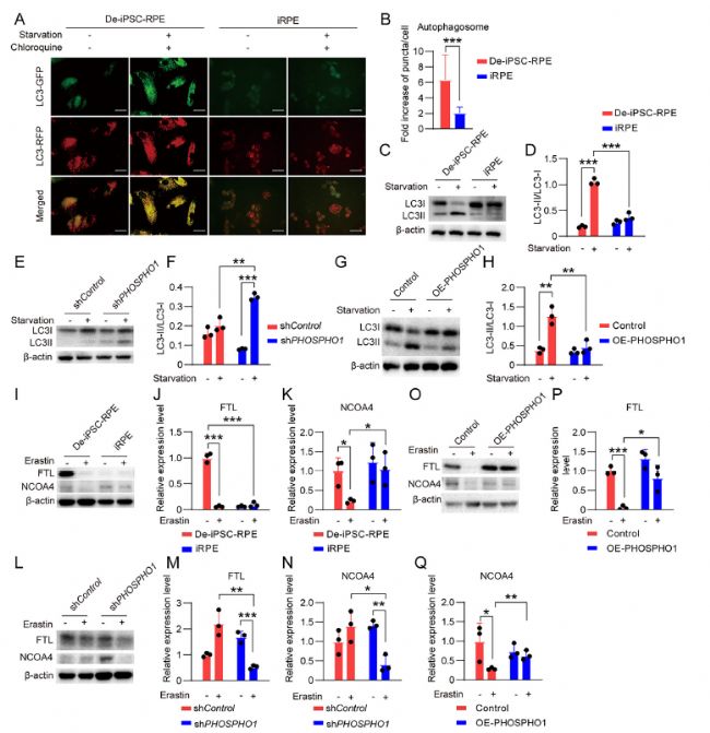 1、鐵蛋白自噬通路驗證:通過 Western blot 檢測發(fā)現(xiàn),敲低 PHOSPHO1 后,iRPE 細胞中 NCOA4 表達升高,F(xiàn)TL(鐵蛋白輕鏈)表達降低,證實鐵蛋白自噬激活(圖 6L-N);過表達 PHOSPHO1 則顯著抑制 NCOA4 表達,阻斷鐵蛋白自噬(圖 6O-Q)。