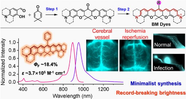 本文要點(diǎn):高性能熒光染料的稀缺,仍是目前的近紅外二區(qū)成像領(lǐng)域面臨的嚴(yán)峻瓶頸,F(xiàn)有染料普遍存在光吸收率低、發(fā)射效率差及合成繁瑣等問(wèn)題。本文提出了一種簡(jiǎn)明的兩步環(huán)化策略,以易得原料構(gòu)建了名為BM-engineered的新型高亮度近紅外二區(qū)染料家族。BM染料具有完全剛性和共平面的骨架,展現(xiàn)出優(yōu)異的摩爾消光系數(shù)(εDCM = 1.9–3.7 × 105 M–1 cm–1)、高熒光量子產(chǎn)率(DCM中ΦF = 10.4–18.0%)以及顯著的光化學(xué)穩(wěn)定性。值得注意的是,BM3以其卓越的近紅外二區(qū)光學(xué)性能(ε = 3.7 × 105 M–1 cm–1,ΦF = 18.4%)重新定義了該領(lǐng)域的光學(xué)性能標(biāo)準(zhǔn),成為迄今報(bào)道的最亮近紅外二區(qū)熒光染料。憑借這一優(yōu)勢(shì),BM3在超低劑量下即可實(shí)現(xiàn)高分辨率生物成像,不僅能夠?qū)崿F(xiàn)腦血管(3 nmol)和淋巴管(75 pmol)成像,還能精確檢測(cè)缺血再灌注模型中微小的腦毛細(xì)血管損傷。更引人注目的是,BM3首次實(shí)現(xiàn)了對(duì)化學(xué)和細(xì)菌刺激引發(fā)的炎癥淋巴系統(tǒng)的精確實(shí)時(shí)追蹤,揭示了先前難以捉摸的不同病理生理模式。本研究不僅開(kāi)創(chuàng)了一種面向超亮近紅外二區(qū)熒光染料的簡(jiǎn)化合成策略,而且拓展了生物成像精度和疾病診斷的前沿,為生物醫(yī)學(xué)創(chuàng)新和臨床應(yīng)用釋放了巨大潛力。