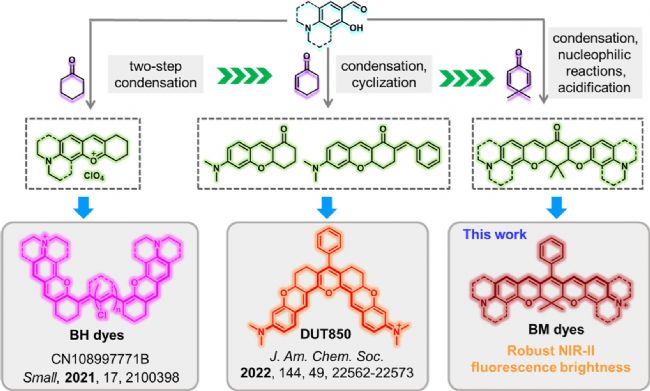 圖1. 以常見(jiàn)原料(水楊醛和環(huán)己酮衍生物)為起始材料,通過(guò)簡(jiǎn)潔的合成路線合理設(shè)計(jì)NIR-II熒光團(tuán)骨架。