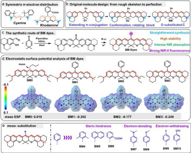 圖2. (a) 花菁和羅丹明染料的對(duì)稱π電子分布。(b) BM染料的設(shè)計(jì)策略。(c) BM染料的合成路線。(d) BM0、BM1、BM2和BM3的靜電表面電勢(shì)。(e) 被各種立體、給電子和吸電子基團(tuán)取代的BM染料的不同結(jié)構(gòu)。