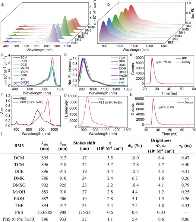 接下來(lái),進(jìn)一步研究了它們的熒光性質(zhì)。如圖3d、所示,三種染料在不同溶劑中的最大熒光波長(zhǎng)(λem)范圍為870 nm至930 nm。具體而言,BM1、BM2和BM3在CH₂Cl₂中的發(fā)射最大值分別位于879 nm、893 nm和912 nm。所有三種染料均隨溶劑極性增加而表現(xiàn)出輕微的發(fā)射藍(lán)移;例如,BM1的λem從CH₂Cl₂中的879 nm移動(dòng)到甲醇中的866 nm。令人滿意的是,BM1和BM2在PBS中表現(xiàn)出優(yōu)異的溶解性,并保持了與有機(jī)溶劑中相當(dāng)?shù)母邿晒鈴?qiáng)度,盡管其λem值略有藍(lán)移(圖3e)。然而,BM3表現(xiàn)出明顯不同的行為:在PBS中的嚴(yán)重聚集極大地猝滅了其發(fā)射(圖3g)。引人注目的是,在加入Tween 80后,BM3在PBS中的熒光強(qiáng)度激增近10倍,達(dá)到與甲醇中相當(dāng)?shù)牧炼人健_@種改善伴隨著λem的顯著紅移,從DCM中的912 nm移動(dòng)到Tween 80溶液(0.5%)中的933 nm,反映了其單體形式的恢復(fù)。