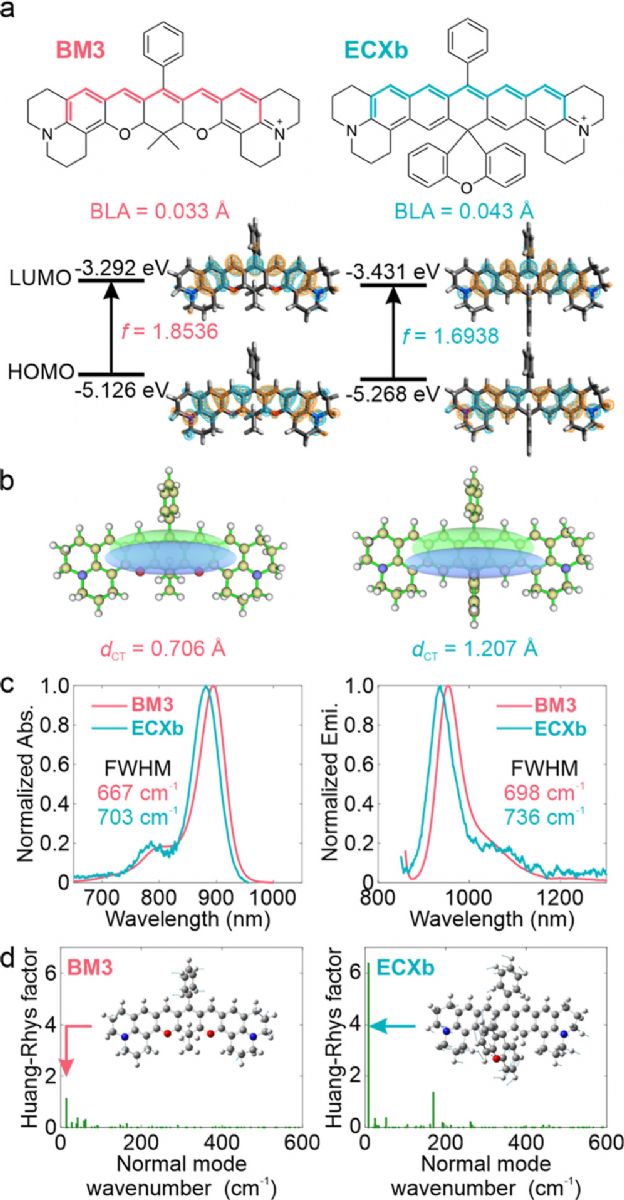 fwhm量化了紫外-可見(jiàn)-近紅外光譜的展寬程度。小的fwhm有助于提高εmax。fwhm的增加(或紫外-可見(jiàn)-近紅外吸收光譜的展寬)主要?dú)w因于溶劑-染料相互作用。較小的fwhm值表明BM3經(jīng)歷的染料-溶劑相互作用弱于ECXb。這很可能是由于BM3中的π共軛網(wǎng)絡(luò)比ECXb中的更。ㄓ帽交翁鎿Q了萘)。出于同樣的原因,研究者還注意到在熒光光譜中BM3的fwhm也小于ECXb(BM3為698 cm⁻¹,ECXb為736 cm⁻¹,圖4c)。增強(qiáng)的振子強(qiáng)度f(wàn)和減小的fwhm共同促成了BM3 εmax的提高。