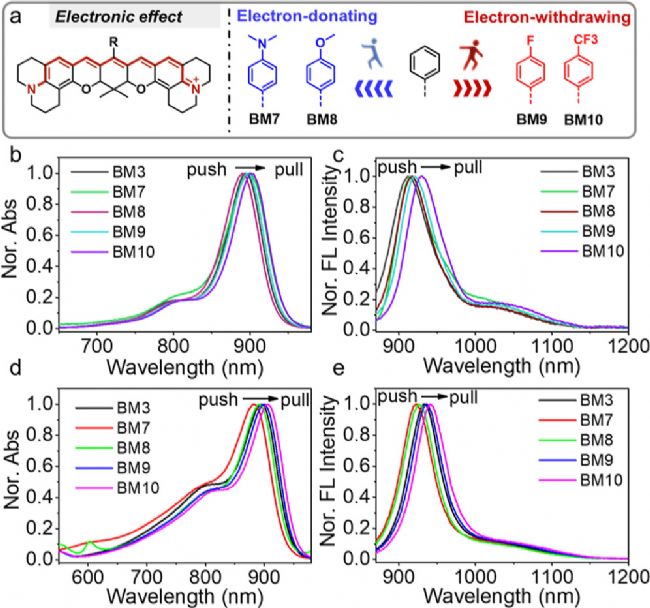 圖5.(a)用不同的供電子基團(tuán)和吸電子基團(tuán)取代的BM染料的不同結(jié)構(gòu)。BM3,7-10在不同有機(jī)溶劑中的紫外-可見(jiàn)-近紅外吸收光譜(b)和發(fā)射光譜(c)。BM3,7-10在含有0.5%吐溫80的PBS中的紫外-可見(jiàn)-近紅外吸收光譜(d)、發(fā)射光譜(e)。