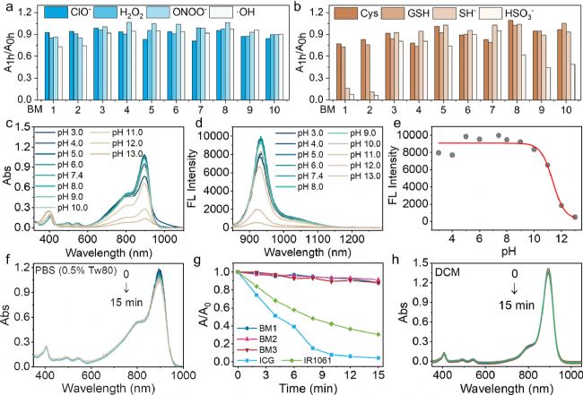 BM染料的共軛聚甲炔骨架含有潛在的親電位點(diǎn),理論上使其易受活性氧或親核試劑的降解。為了嚴(yán)格評(píng)估其化學(xué)穩(wěn)定性,將染料與一組氧化性試劑(ClO⁻、H₂O₂、ONOO⁻、•OH)和還原性試劑(GSH、Cys、SH⁻、HSO₃⁻)共同孵育。如圖7a、b所示,與ClO⁻(100 μM)、H₂O₂(100 μM)、ONOO⁻(100 μM)和•OH(100 μM)孵育1小時(shí)后,大多數(shù)BM染料保留了超過(guò)90%的原始吸光度,強(qiáng)烈表明它們對(duì)氧化應(yīng)激具有優(yōu)異的抵抗性。同時(shí),當(dāng)暴露于強(qiáng)還原性環(huán)境(包括Cys(100 μM)、GSH(1000 μM)、SH⁻(100 μM)和HSO₃⁻(100 μM))時(shí),大多數(shù)BM染料也表現(xiàn)出顯著的抵抗性。BM1和BM2的中等敏感性可能歸因于其末端氨基取代基的化學(xué)性質(zhì),這可能促進(jìn)了替代的還原途徑。BM3及其類似物(具有剛化的環(huán)狀氨基)具有更優(yōu)異的穩(wěn)定性,進(jìn)一步證實(shí)了這種結(jié)構(gòu)依賴的反應(yīng)性。重要的是,測(cè)試中使用的還原試劑濃度與生理水平一致,而氧化試劑的濃度遠(yuǎn)遠(yuǎn)超過(guò)典型的生理活性氧水平。因此,可以得出結(jié)論,BM染料(其中BM3最為突出)具有完全足以用于生物應(yīng)用的化學(xué)穩(wěn)定性。值得注意的是,分散劑Tween 80顯著增強(qiáng)了BM3的表觀pH穩(wěn)定性。在Tween 80溶液中,僅在pH > 11時(shí)才觀察到顯著的光譜變化(圖7c–e),表明膠束包封提供了額外的抗堿水解保護(hù)作用。