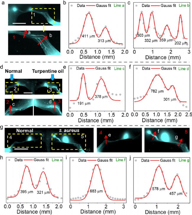 為了進(jìn)一步展示BM3的生物醫(yī)學(xué)應(yīng)用潛力,利用松節(jié)油和金黃色葡萄球菌感染構(gòu)建了兩種淋巴炎癥模型,并研究了淋巴系統(tǒng)的變化。不同的刺激導(dǎo)致淋巴系統(tǒng)發(fā)生不同的改變。在松節(jié)油刺激組中,淋巴結(jié)顯示腫脹,兩條平行的傳入淋巴管表現(xiàn)出明顯的增厚(圖9d)。兩條傳入淋巴管的fwhm(圖9e、f)分別為782 μm和301 μm,比對(duì)照組(378 μm和191 μm)寬得多(約2倍)。另一方面,金黃色葡萄球菌感染組在淋巴系統(tǒng)中誘導(dǎo)了更強(qiáng)的炎癥反應(yīng)。從圖9g中可以明顯看出,傳入和傳出淋巴管均腫脹增厚,約為正常組的1.5倍。感染組兩條傳入淋巴管的fwhm分別為578 μm和457 μm(圖9j),而對(duì)照組分別為395 μm和321 μm(圖9h)。此外,兩個(gè)淋巴結(jié)的體積顯著增大,同時(shí)熒光增強(qiáng),腫脹至正常組的約3倍(圖9i)。統(tǒng)計(jì)比較顯示,金黃色葡萄球菌感染使淋巴管相對(duì)于對(duì)照組擴(kuò)張約1.8倍。這些發(fā)現(xiàn)標(biāo)志著NIR-II熒光成像向前邁出了重要一步。這是首個(gè)能夠?qū)崿F(xiàn)由化學(xué)和細(xì)菌刺激誘導(dǎo)的炎癥淋巴網(wǎng)絡(luò)如此高分辨率成像的NIR-II熒光染料,揭示了兩種模型之間不同的病理生理模式。