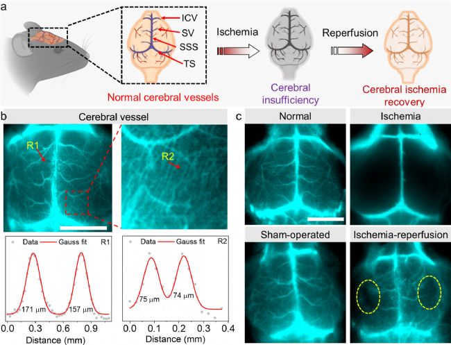 為進(jìn)一步展示BM3在腦血管造影中的優(yōu)勢(shì)和潛力,研究者建立了腦缺血再灌注小鼠模型。如圖10a和c所示,在主動(dòng)脈血管未受影響、血流通暢的假手術(shù)組和正常組中,BM3注射后清晰顯示了主要腦血管以及復(fù)雜密集交織的毛細(xì)血管網(wǎng)絡(luò)。圖像顯示出極其豐富和復(fù)雜的微血管結(jié)構(gòu),凸顯了BM3在高分辨率血管成像方面的卓越能力。與之形成鮮明對(duì)比的是,缺血小鼠全腦出現(xiàn)顯著的血管熒光信號(hào)缺失,僅SSS、TS和ICV仍可見(jiàn)血流(圖10c)。其他區(qū)域熒光的缺失直接反映了腦灌注的中斷。再灌注后,部分腦血流恢復(fù)成功使許多血管重新顯影,尤其是SV等較大結(jié)構(gòu)。然而,與對(duì)照組相比,微血管網(wǎng)絡(luò)仍然嚴(yán)重受損,大量毛細(xì)血管變得模糊或完全消失。這可能是由于缺血引起的壞死或再灌注期間局部壓力導(dǎo)致微血管破裂所致。這些損傷導(dǎo)致熒光圖像中形成了明顯的"黑色區(qū)域",即無(wú)血流區(qū)域,如果缺血時(shí)間延長(zhǎng),這些區(qū)域有可能演變?yōu)槿毖詨乃啦∽儭?/span>