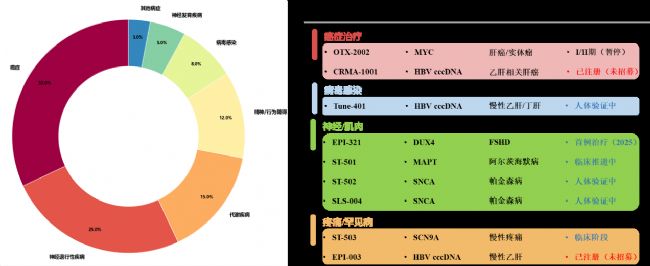 圖3. 表觀遺傳編輯核心應(yīng)用病癥分布(左圖)及治療性藥物(右圖)