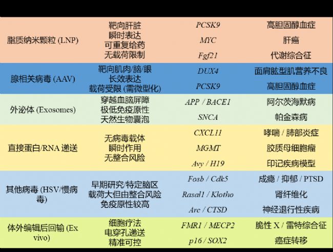 將表觀遺傳編輯器高效送入靶細胞曾是臨床轉(zhuǎn)化的核心瓶頸,如今已突破多種遞送方法:LNP憑借無載荷限制與瞬時表達特性,主導(dǎo)了PCSK9和MYC等肝臟療法的臨床落地;AAV依托組織嗜性與長效表達,結(jié)合微型化策略攻克了神經(jīng)肌肉疾病的治療難題;外泌體利用天然穿越血腦屏障優(yōu)勢,實現(xiàn)了阿爾茨海默病與帕金森病的無創(chuàng)鼻噴給藥;直接蛋白/RNA遞送在肺部及胚胎場景中展現(xiàn)了零整合風(fēng)險;而體外編輯回輸則為血液病提供了精準可控的新路徑。這些突破性工具正加速推動表觀遺傳編輯從概念走向臨床現(xiàn)實。