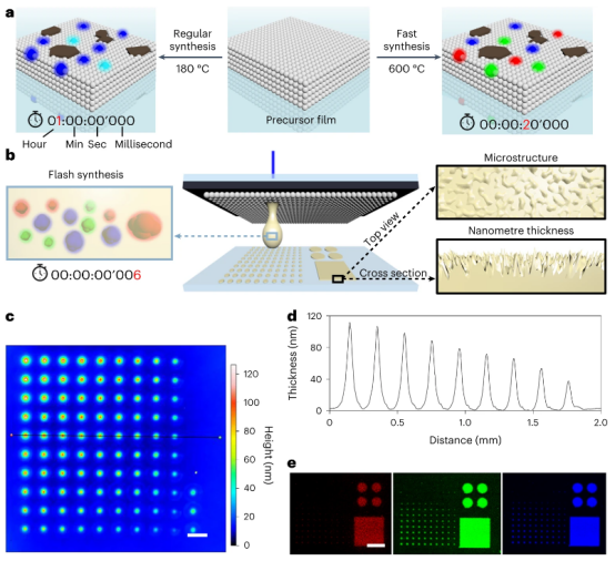 圖1 nanoFlash合成方法的原理和轉(zhuǎn)移圖案的表征 a,溫度與時間是影響CD前體形成CD并產(chǎn)生不同熒光的關(guān)鍵因素;b,通過調(diào)節(jié)激光脈沖可以驅(qū)動CD前體形成不同微觀圖案的SSF;c,d,通過調(diào)節(jié)激光脈沖可以驅(qū)動CD前體形成不同高度的SSF;e,使用激光共聚焦熒光微陣列生物芯片掃描分析儀InnoScan 1100 AL進行紅綠藍三色通道掃描制成的SSF圖案