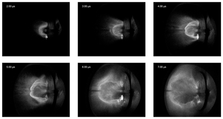 如圖所示。典型的放電演變(在一系列重復(fù)放電中拍攝的單幅圖像),主電容組充電至正負(fù)3 kV,t=0對(duì)應(yīng)觸發(fā)晶閘管。重探頭在左邊是一條線形的陰影。