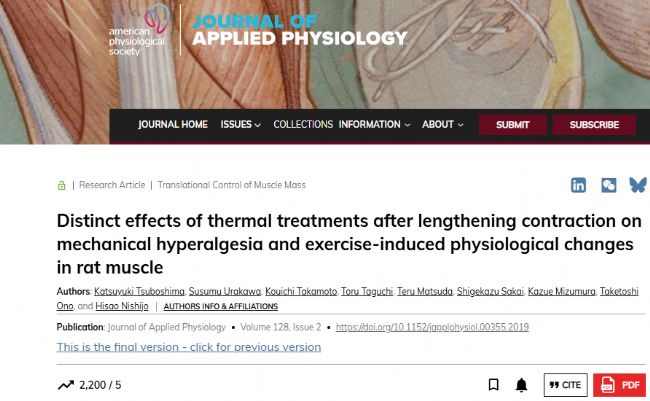 富山大學(xué)醫(yī)學(xué)部的Hisao Nishijo教授團隊在國際學(xué)術(shù)期刊《Journal of Applied Physiology》上發(fā)表了一項題為《Distinct effects of thermal treatments after lengthening contraction on mechanical hyperalgesia and exercise-induced physiological changes in rat muscle》的研究。研究團隊通過大鼠模型,系統(tǒng)探討了運動后即刻進行熱敷或冰敷對延遲性肌肉酸痛的緩解效果及其生理和代謝機制。