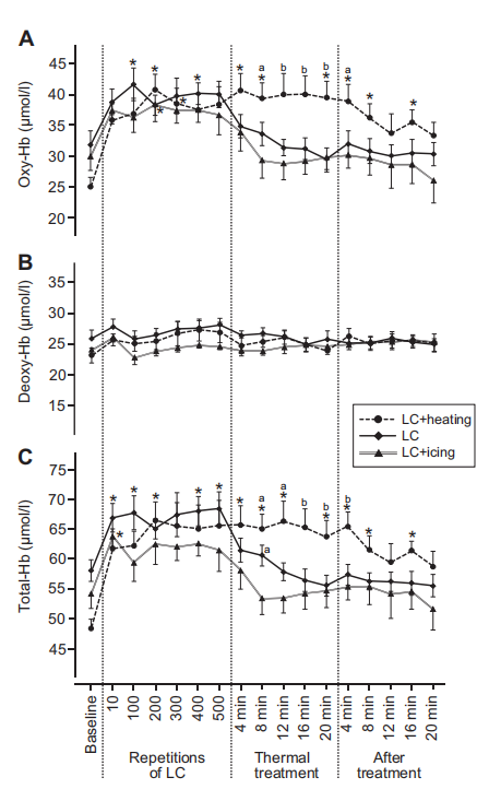 、* 與拉長收縮前相比差異較大(分別為 P<0.05、P<0.01);# 與 LC 組(P<0.001)及 LC + 冰敷組(P<0.01)相比差異顯著。