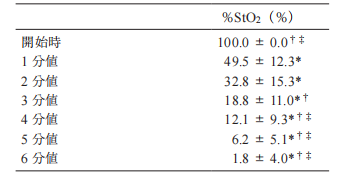 血流限制后 2 分鐘的 % StO₂與 4、5、6 分鐘存在差異,4 分鐘后 % StO出現(xiàn)下降,3 分鐘的 % StO₂與 4、5、6 分鐘無(wú)明顯差異。