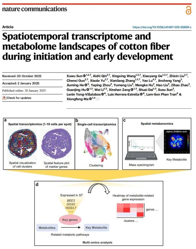 2025年1月20日,河南大學孫旭武教授團隊在《Nature Communications》上發(fā)表了題為“Spatiotemporal transcriptome and metabolome landscapes of cotton fiber during initiation and early development”的研究論文。該研究采用新興的“時空多組學”分析策略,通過結合空間代謝組學(基于AFADESI-Orbitrap質譜成像技術)、空間轉錄組學與單細胞轉錄組學,系統(tǒng)揭示了棉纖維分化起始階段(開花前1.5天至開花后2天)與早期伸長階段(開花后3-5天)的基因代謝物調控網(wǎng)絡,進而精確鎖定用于育種改良的關鍵靶點。該研究為解析棉花及其他植物發(fā)育過程調控機制提供新的方法范式。