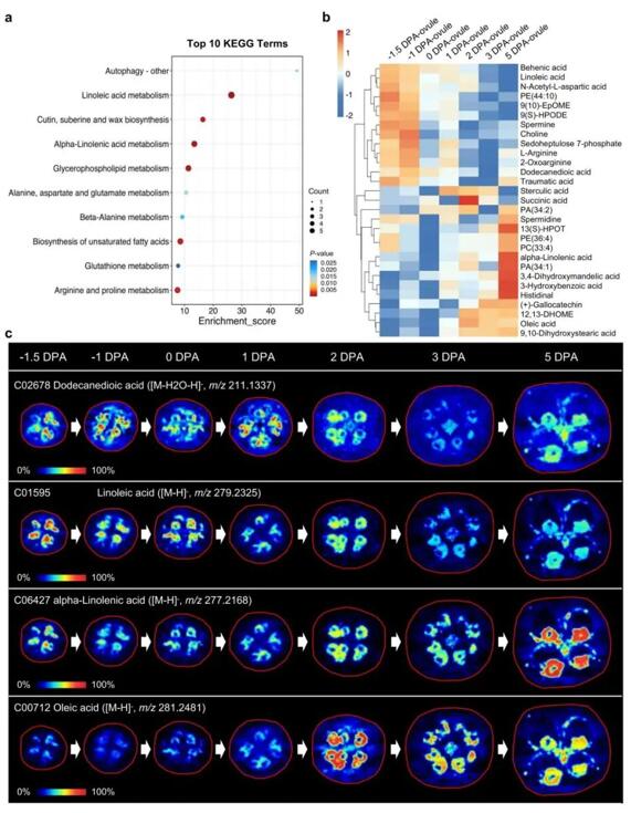 研究采用AFADESI-Orbitrap質譜成像技術對不同發(fā)育階段的棉鈴整體切片(開花前1.5天至開花后5天,DPA)進行空間代謝組學分析,成功捕獲了數(shù)千種代謝物分子(涵蓋有機酸、氨基酸、多胺、碳水化合物、膽堿、核苷酸、核苷、倍半萜類、苯類化合物、脂肪酸及各類磷脂等)的空間分布信息。篩選差異代謝物發(fā)現(xiàn)脂肪酸、胺類、氨基酸及肽類等在胚珠中特異表達。進一步分析胚珠中代謝物積累動態(tài)發(fā)現(xiàn)十二烷二酸、亞油酸、精胺等濃度從-1.5DPA到5DPA逐漸降低,提示與棉纖維“起始”階段密切相關,而α-亞麻酸、組氨酸和油酸等則濃度逐漸升高,提示與棉纖維“伸長”階段密切相關。該研究證實AFADESI-Orbitrap質譜成像技術具有高靈敏、廣覆蓋的獨特優(yōu)勢,同時也凸顯了其在解析植物發(fā)育過程中時空代謝動態(tài)的卓越能力。