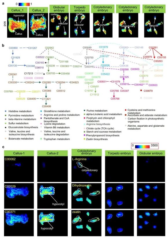 研究基于AFADESI-Orbitrap質譜成像技術,精準繪制了SE過程中愈傷組織、球形胚、魚雷胚與子葉胚四個關鍵階段的時空代謝圖譜:愈傷組織階段L-組氨酸、L-纈氨酸顯著富集;球形胚中精胺、亞精胺顯著富集;魚雷胚中芥子堿等苯丙素類物質富集;子葉胚中則富集N-氨基甲酰腐胺等物質,其皮層組織中富集亞油酸等。研究以代謝圖譜作為空間錨點整合多組學數(shù)據(jù),揭示了SE過程中基因-代謝物調控網(wǎng)絡,并鎖定了關鍵調控因子,為突破棉花體細胞胚胎發(fā)生的品種依賴性和效率瓶頸提供了全新的解決方案。